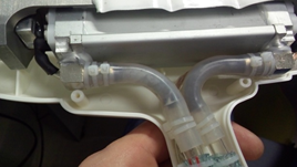 После того, как Вы залили воду в систему и включили аппарат, он может уйти в ошибку, которая будет сопровождаться звуковым сигналом. На дисплее появится значок трубки с неподвижной водой. Это говорит о том, что в системе имеется либо засор, либо воздушная пробка. Чтобы удалить пробку необходимо либо полностью слить воду и заново налить, либо продавить воздух, который скопился в помпе. Чтобы продавить воздух с помпы необходимо отсоединить шланг от фитинга, который вставляется в блок и несильно дунуть в шланг, чтобы из аппарата вышло незначительное количество воды. Далее подсоединяем на место шланг и включаем аппарат для проверки циркуляции (звука ошибки нет, на экране значок трубки с циркулирующей в ней водой). Если аппарат опять ушел в ошибку это говорит о том, что воздушная пробка не сместилась с помпы и необходимо повторить операцию до удаления пробки.