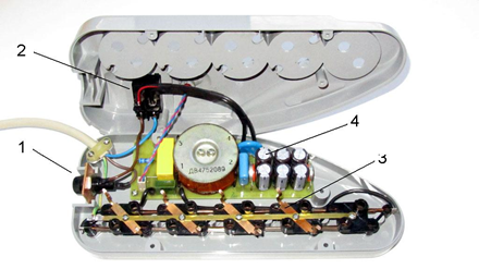 Многие путают обычный удлинитель с СФ, так как внешне они очень похожи. Поэтому остановимся на выборе СФ. СФ должен включать в себя предохранитель (1), кнопку включения (2), набор розеток с заземлением (3), и внутри должна находиться микросхема (фильтр помех- 4).